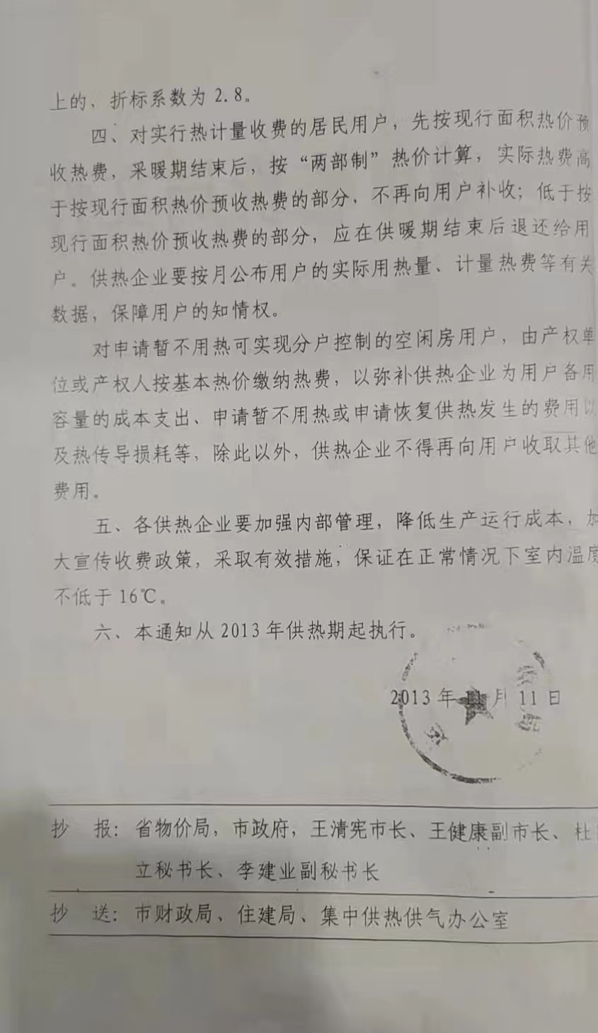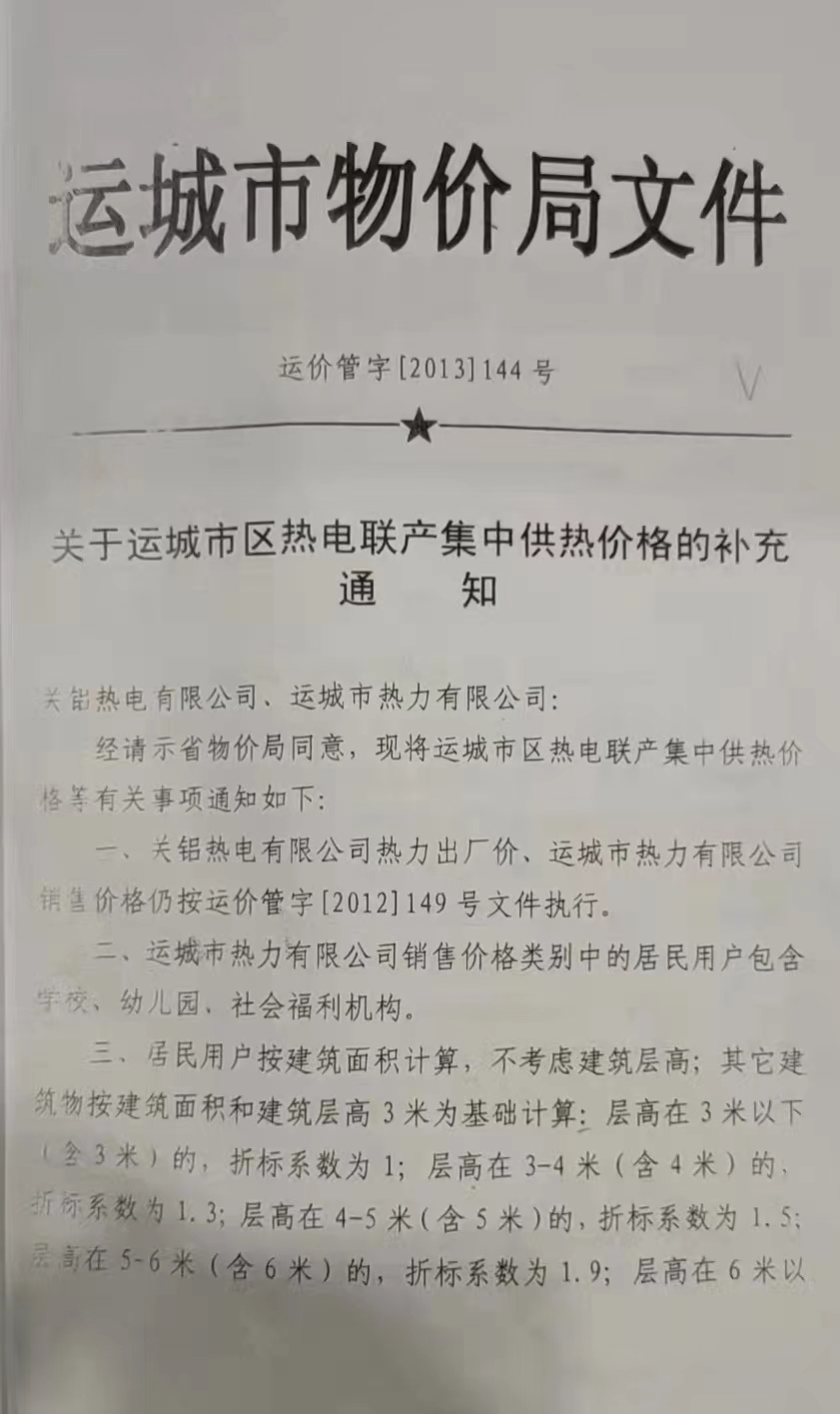 關于運城市區熱電聯產集中供熱價格的補充通知